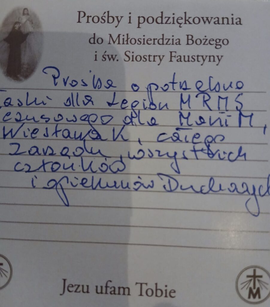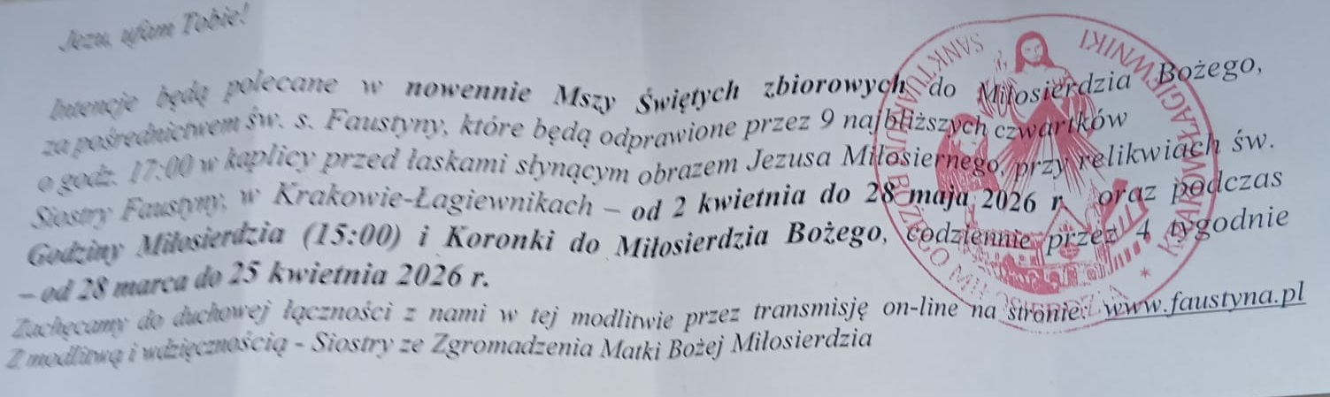 Dwie Nowenny z Mszy św. od rycerki Małgosi z Krakowa: Szczęść Boże! Dziś (28.02.2026r.) zamówiłam Nowennę na czas Wielkiego Tygodnia i Nowennę do Bożego Miłosierdzia. mr Małgorzata K. z Krakowa. Wielkie Bóg zapłać całej Wspólnocie z Panem Bogiem.