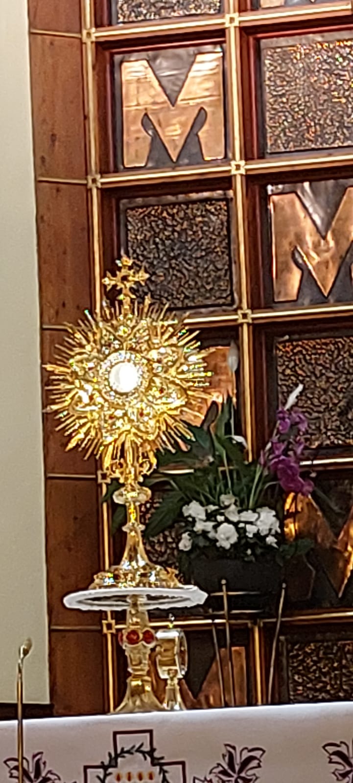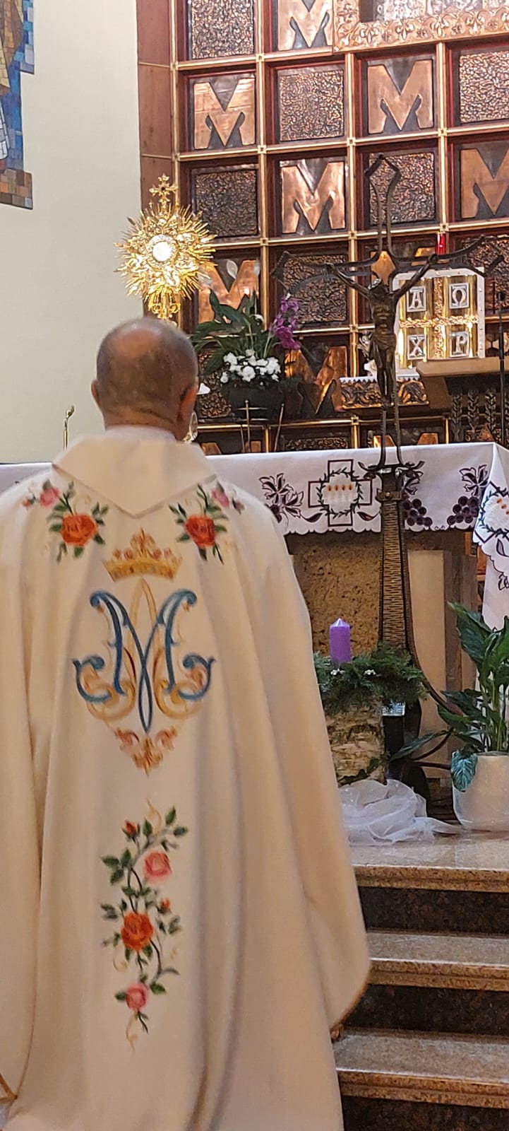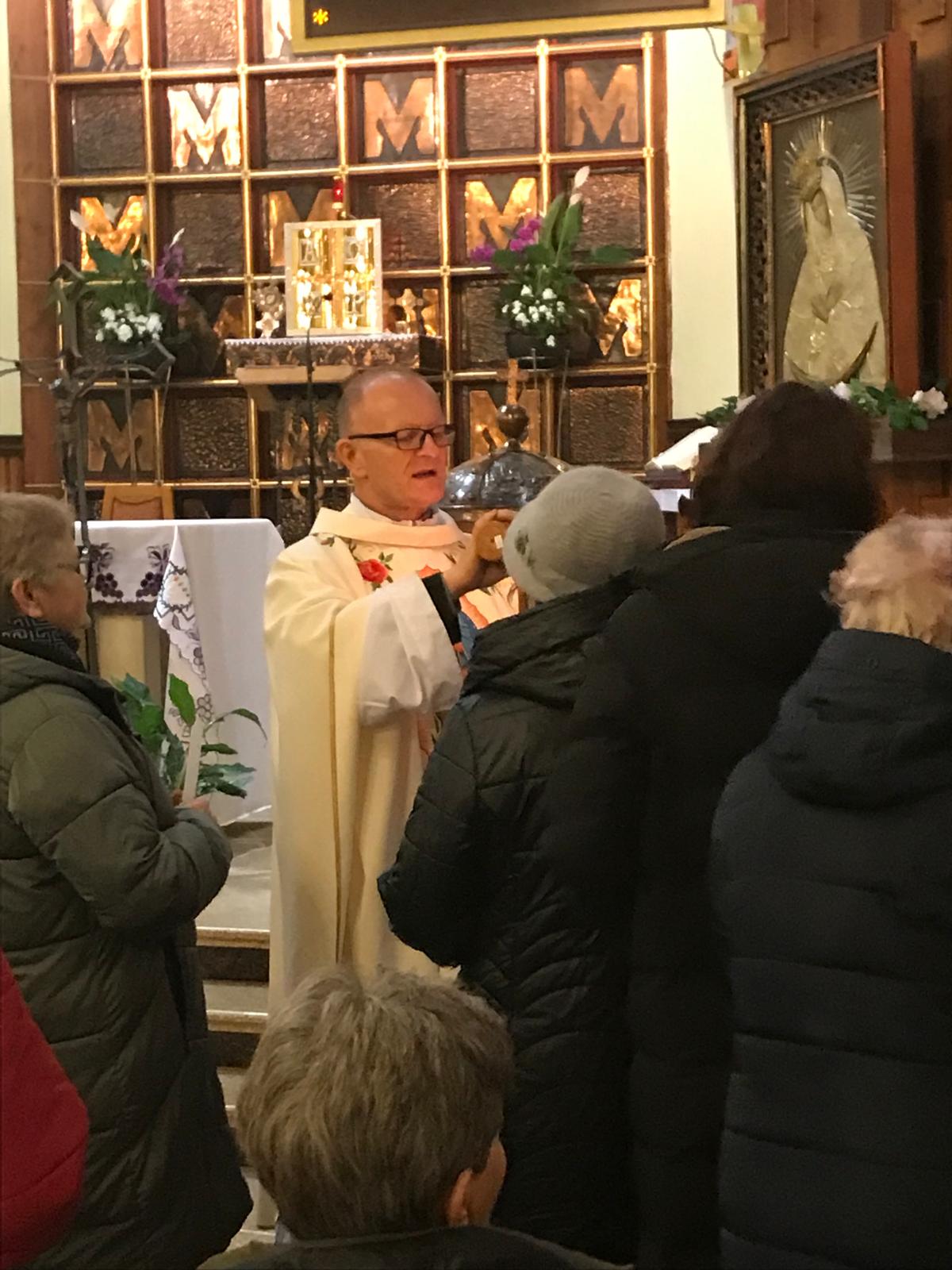 Ksiądz Lesław wystawił Przenajświętszy Sakrament i poprowadził krótką adorację , a później my prowadziliśmy Różaniec, również śpiewając poszczególne dziesiątki dzięki naszym rycerzom Lucjanowi i Jadzi przy akompaniamencie Pana organisty Mariusza.