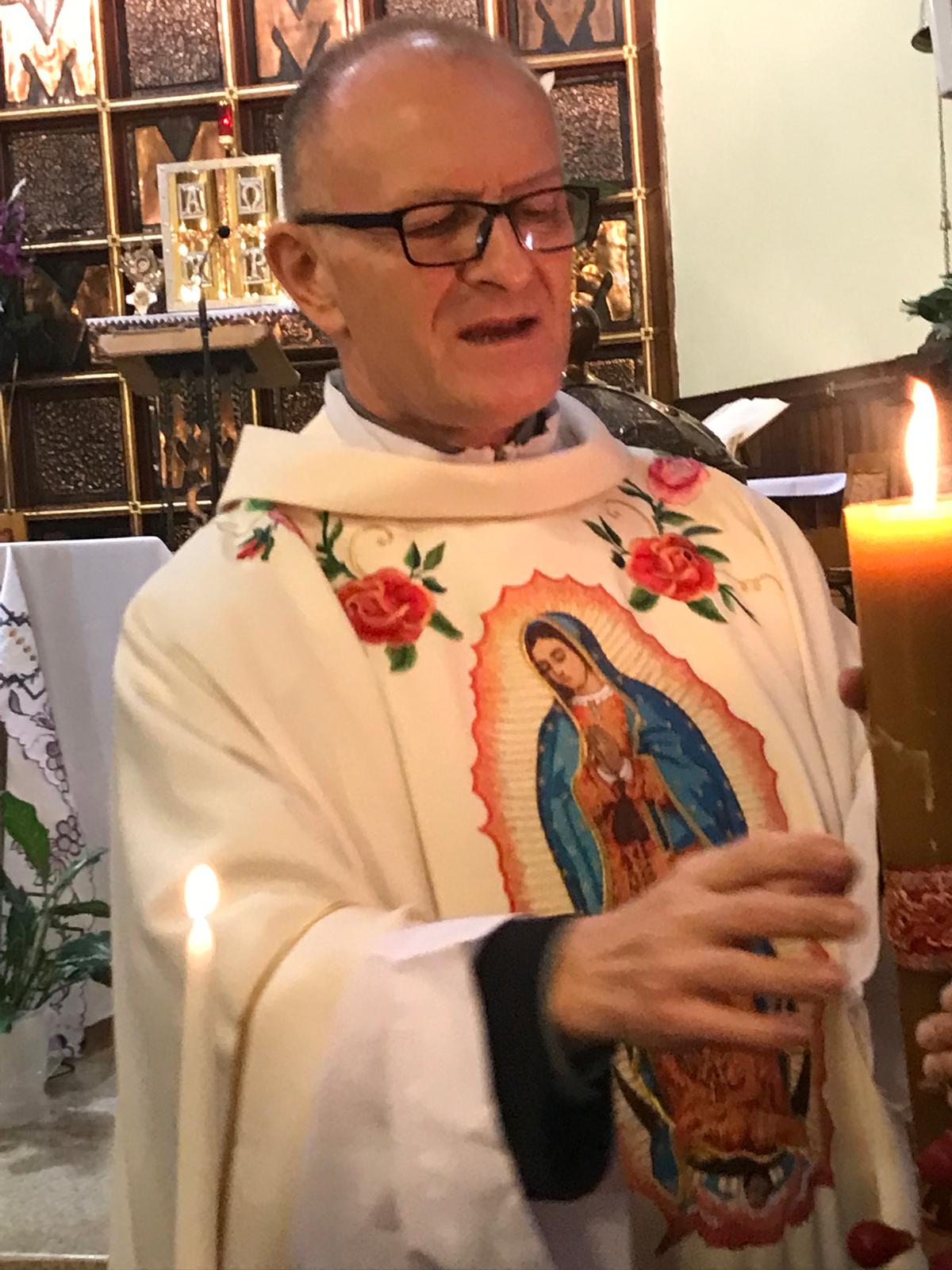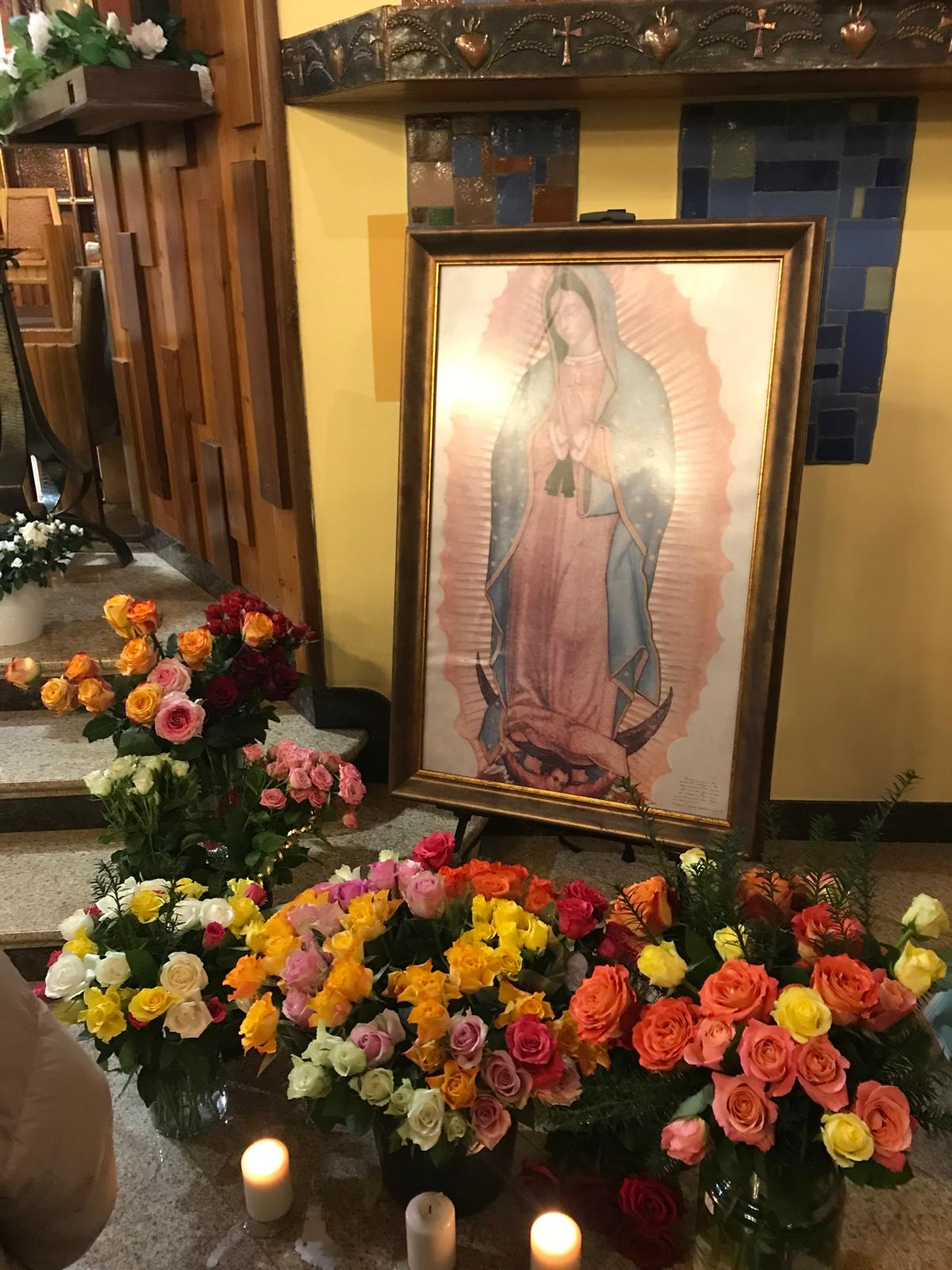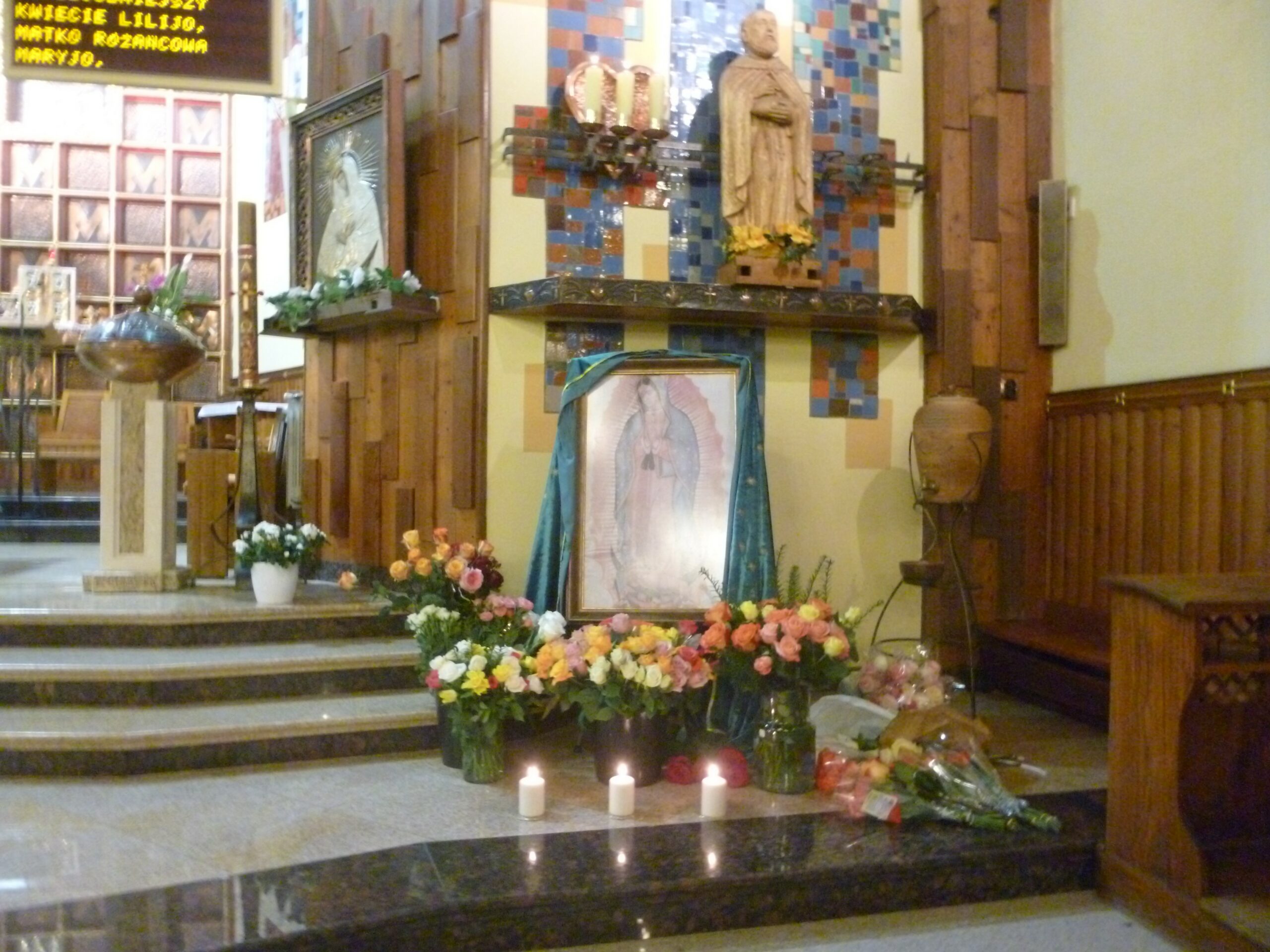 Matka Boża z Guadalupe w obrazie okrytym płaszczem księdza kustosza udekorowana była pięknymi różami, przy zapalonych świecach.