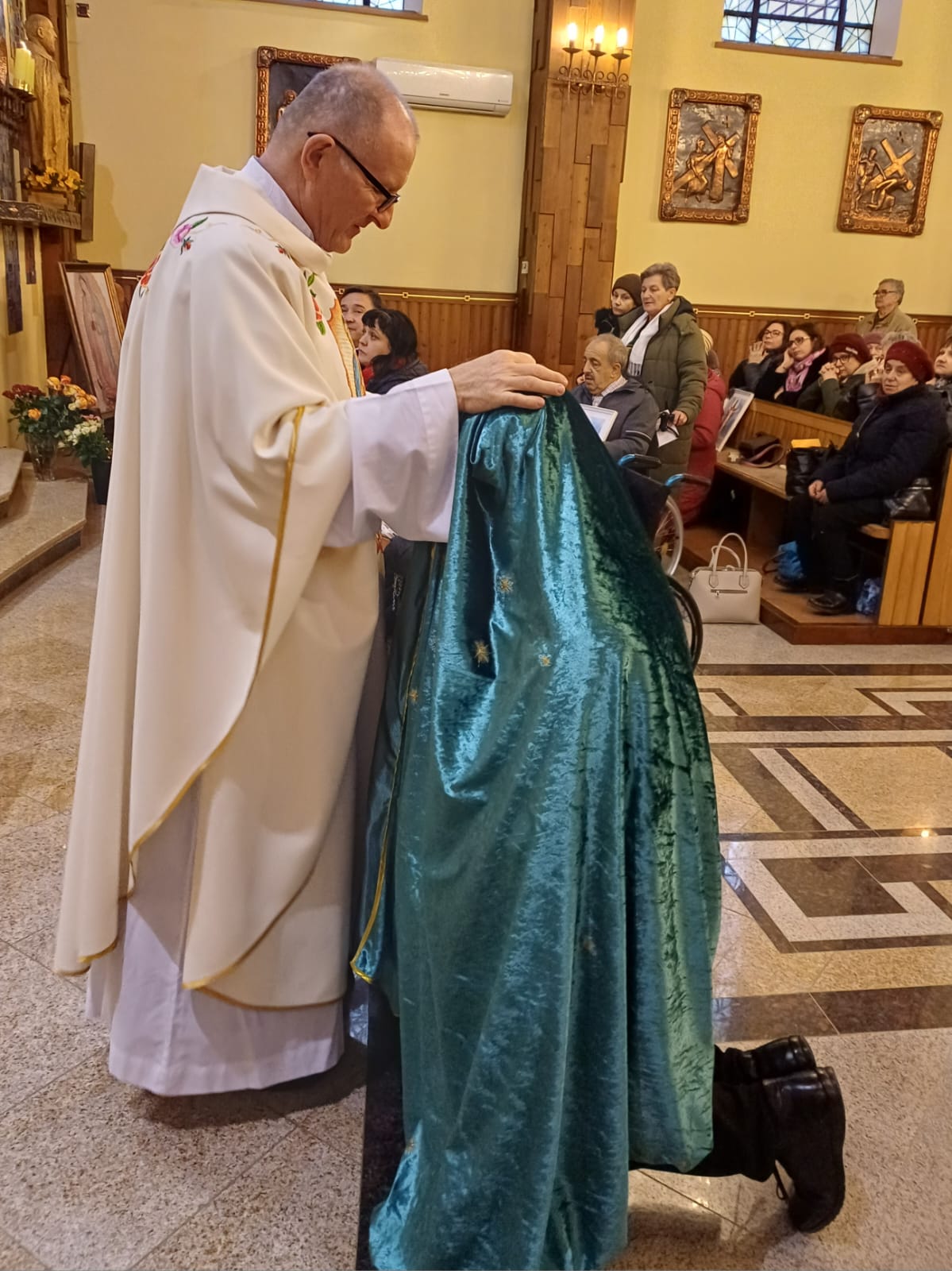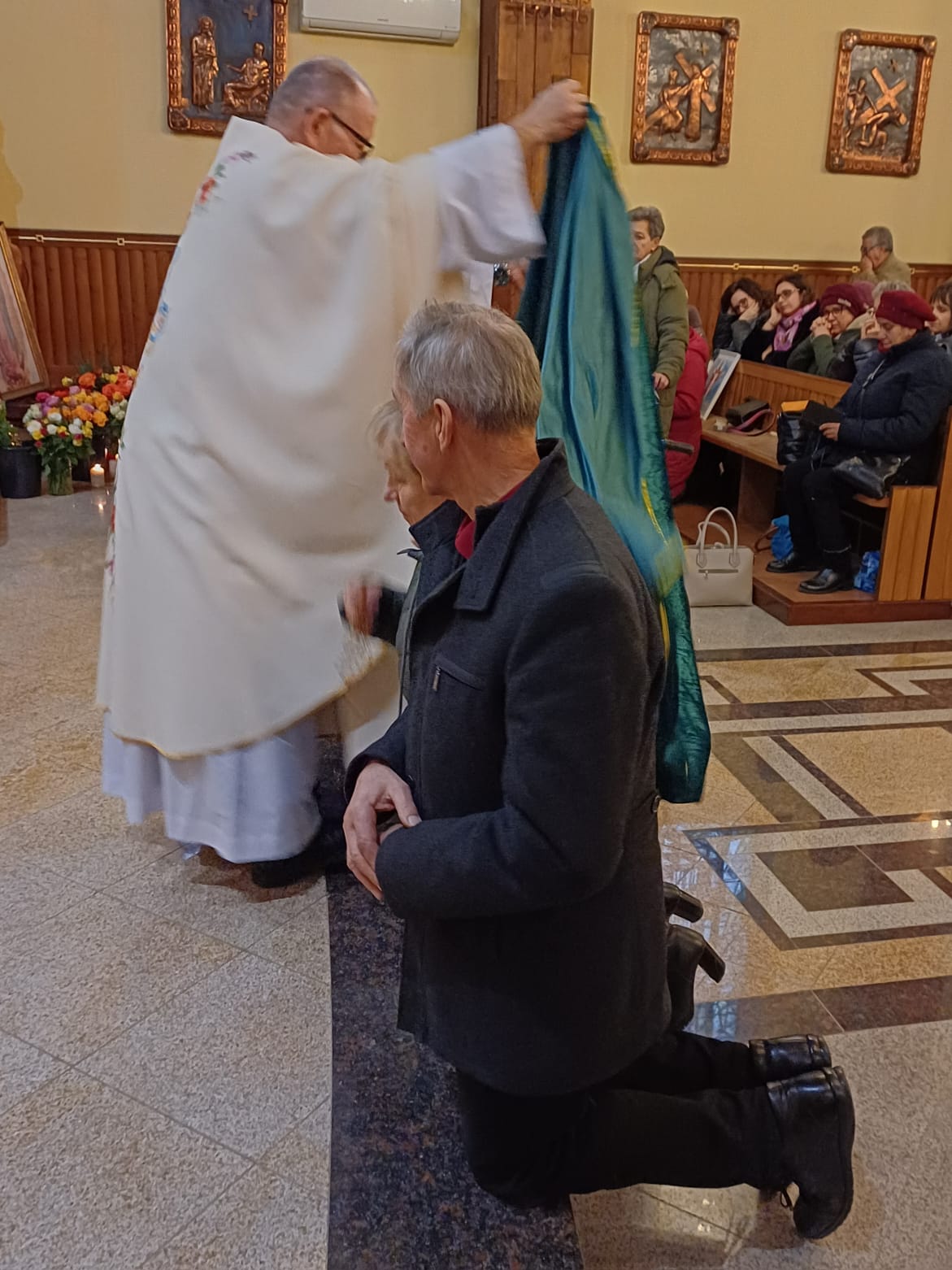 Następnie każdy został nakryty płaszczem Matki Bożej z błogosławieństwem wypowiadanym przez księdza.