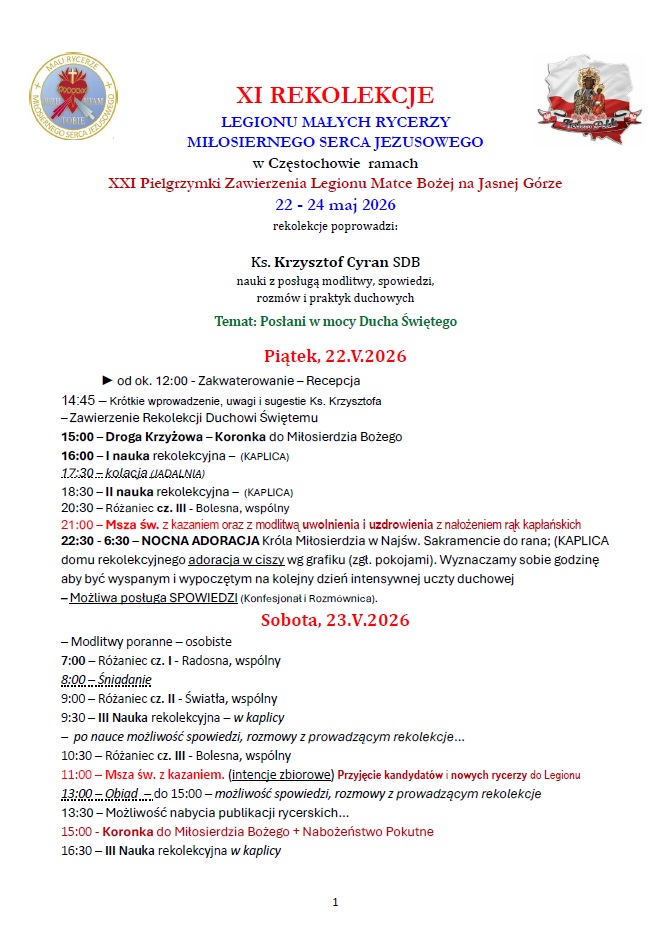 4. Uwaga: Prośba do wszystkich Małych Rycerzy i uczestników duchowej uczty w Częstochowie o duchowe wsparcie tak XI Rekolekcji jak i XXI Pielgrzymki Zawierzenia Legionu.